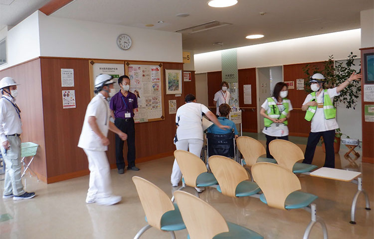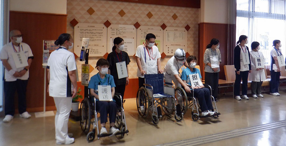 7月18日外来エリアにて避難訓練を実施しました。外来エリアは広いため、院内の様々な職種で協力して実施しました。外来受診の患者様にもご協力いただきありがとうございました。今後も緊急時に速やかに避難し、患者さん、職員の安全が確保できるように継続して訓練を実施する予定としています。