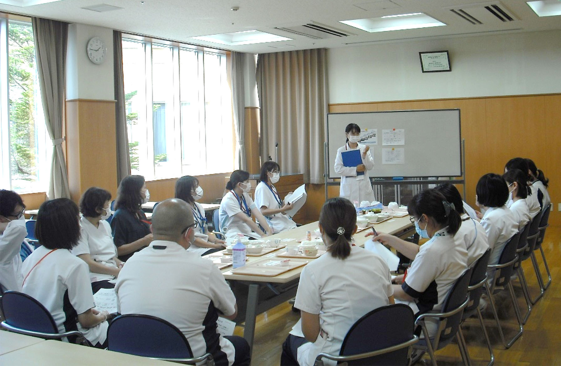 昨年度、当院では他病院・他施設間での食形態の連携を行いやすくするため、嚥下調整食の食種名などの見直しを行いました。勉強会では日本摂食嚥下リハビリテーション学会から発表されている嚥下調整食分類について学び、実際に当院で提供している嚥下調整食と軟食の試食を行いました。医師・看護師をはじめ多職種、計17名のスタッフが参加し、「形態の実際を見て、試食して、より理解することができた」「色んなバリエーションで作って頂けるので、患者さんにどれが合っているのかアセスメントしていきたいと思った」などのコメントをいただきました。